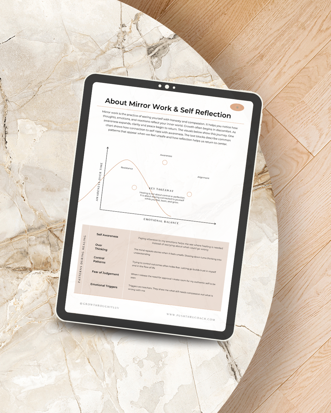 Mirror work is more than simply looking in a mirror and repeating affirmations. It is the practice of seeing yourself with honesty and compassion. It is choosing to sit with your emotions instead of avoiding them. It is paying attention to the patterns that show up in your relationships, your triggers, your reactions, and the stories you continue to tell yourself. Mirror work helps you recognize what needs attention within you so you can move with intention instead of survival. It teaches you to take your power back by understanding your inner world rather than blaming the outer one.